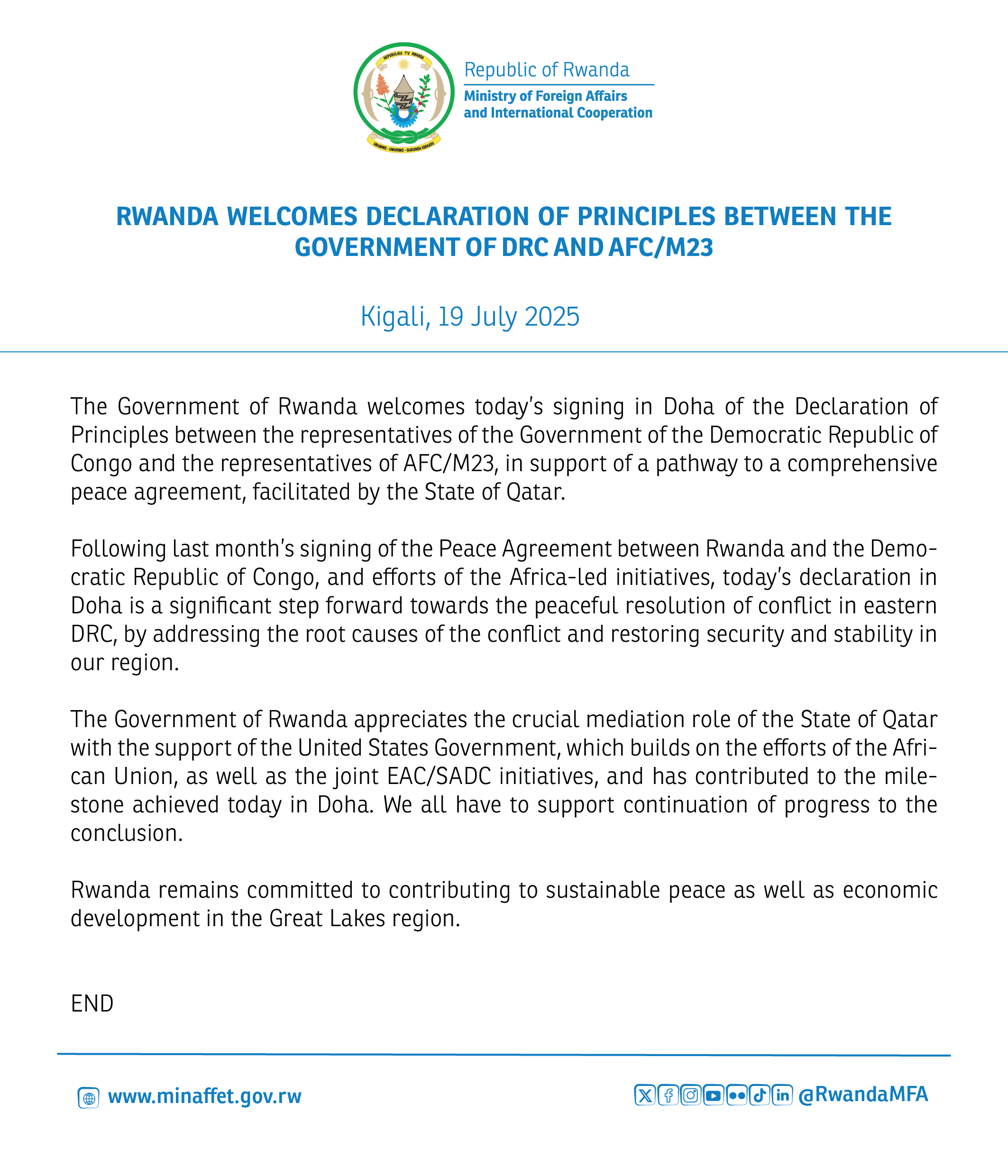 Rwanda welcomes Declaration of Principles between the Government of DRC and AFC/M23